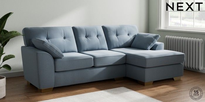 7.2.10 Stamford Buttoned Back Medium Sofa Chaise - Right Hand Relaxed Linen Look Mid Blue Large Square Angle - Brushed Brass | Made Click here to use our website with more accessibility support, for example screen readers