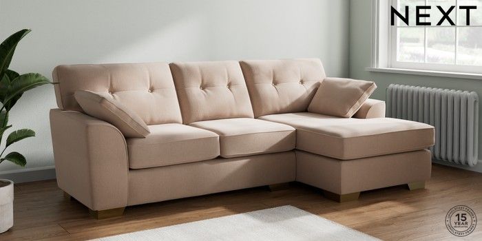 7.2.10 Stamford Buttoned Back Medium Sofa Chaise - Right Hand Relaxed Linen Look Mid Natural Large Square Angle - Brushed Brass | Made Click here to use our website with more accessibility support, for example screen readers