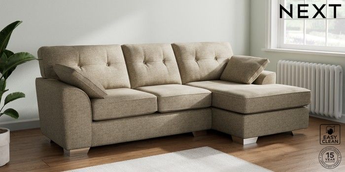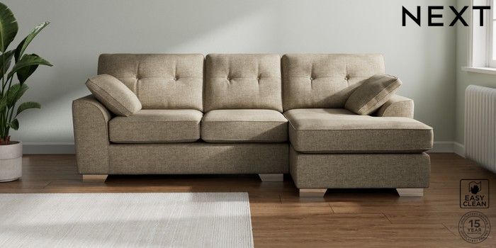 7.2.10 Stamford Buttoned Back Medium Sofa Chaise - Right Hand Woven Chenille Easy Clean Mid Natural Large Square Angle - Chrome Metal | Made Click here to use our website with more accessibility support, for example screen readers