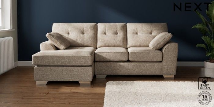 7.2.10 Stamford Buttoned Back Small Sofa Chaise - Left Hand Chunky Boucle Easy Clean Mid Natural Large Square Angle - Chrome Metal | Made Click here to use our website with more accessibility support, for example screen readers