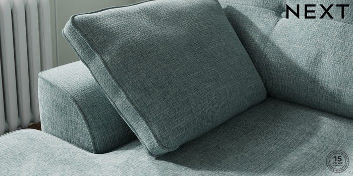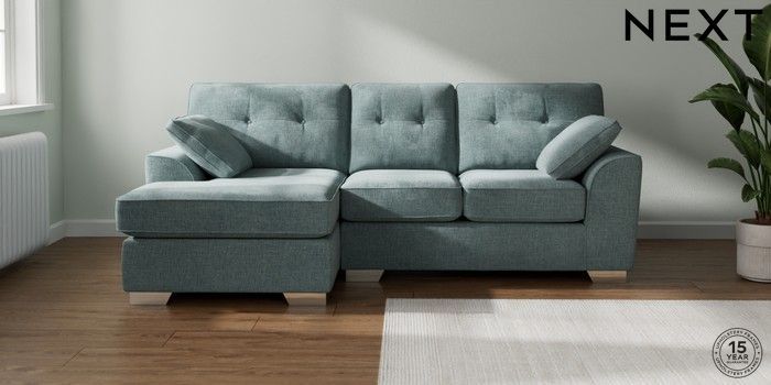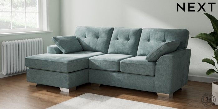 7.2.10 Stamford Buttoned Back Small Sofa Chaise - Left Hand Chunky Chenille Light Teal Green Large Square Angle - Chrome Metal | Made Click here to use our website with more accessibility support, for example screen readers