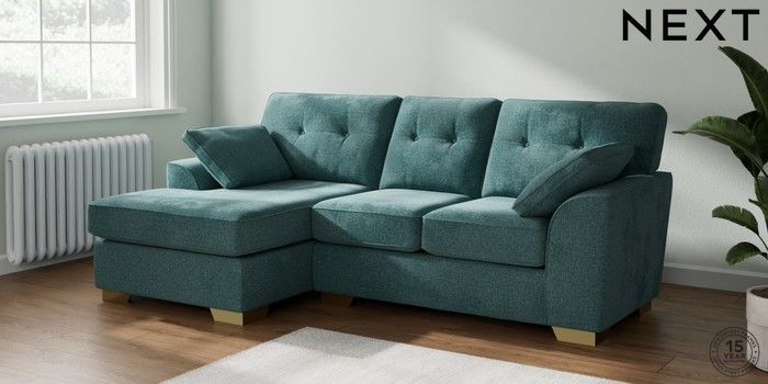 7.2.10 Stamford Buttoned Back Small Sofa Chaise - Left Hand Chunky Chenille Mid Teal Green Large Square Angle - Brushed Brass | Made Click here to use our website with more accessibility support, for example screen readers