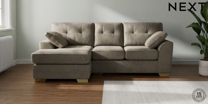 7.2.10 Stamford Buttoned Back Small Sofa Chaise - Left Hand Cotswold Chenille Mid Mink Brown Large Square Angle - Brushed Brass | Made Click here to use our website with more accessibility support, for example screen readers