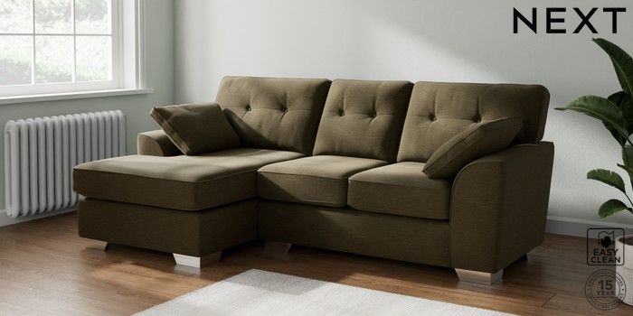 7.2.10 Stamford Buttoned Back Small Sofa Chaise - Left Hand Fine Chenille Easy Clean Dark Moss Green Large Square Angle - Chrome Metal | Made Click here to use our website with more accessibility support, for example screen readers