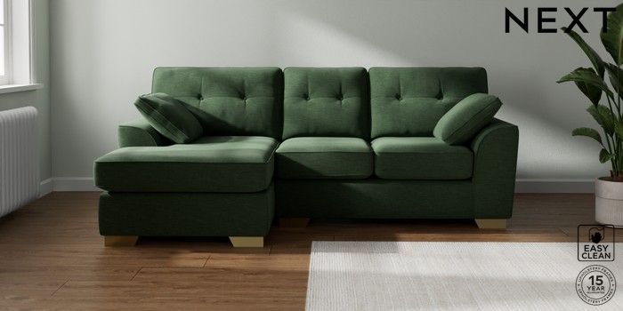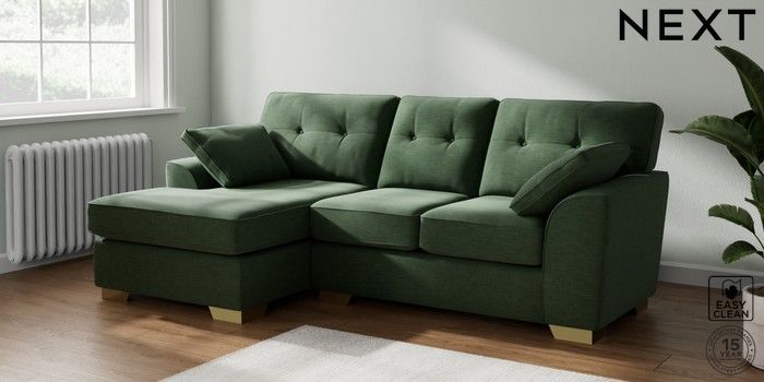 7.2.10 Stamford Buttoned Back Small Sofa Chaise - Left Hand Fine Chenille Easy Clean Mid Khaki Green Large Square Angle - Brushed Brass | Made Click here to use our website with more accessibility support, for example screen readers