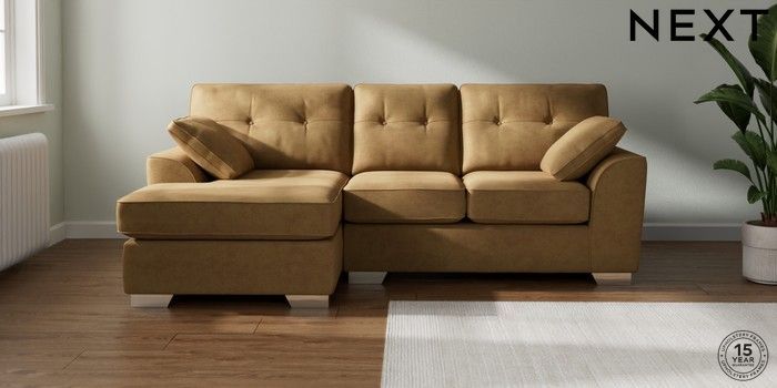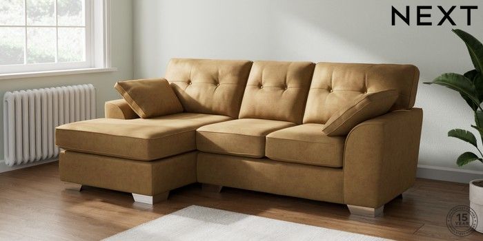 7.2.10 Stamford Buttoned Back Small Sofa Chaise - Left Hand Luxe Chenille Honey Yellow Large Square Angle - Chrome Metal | Made Click here to use our website with more accessibility support, for example screen readers