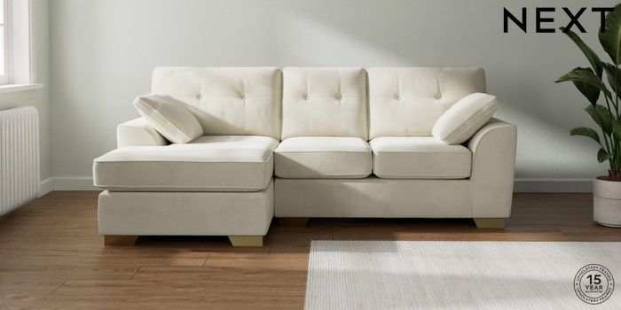 7.2.10 Stamford Buttoned Back Small Sofa Chaise - Left Hand Luxe Chenille Oyster Large Square Angle - Brushed Brass | Made Click here to use our website with more accessibility support, for example screen readers