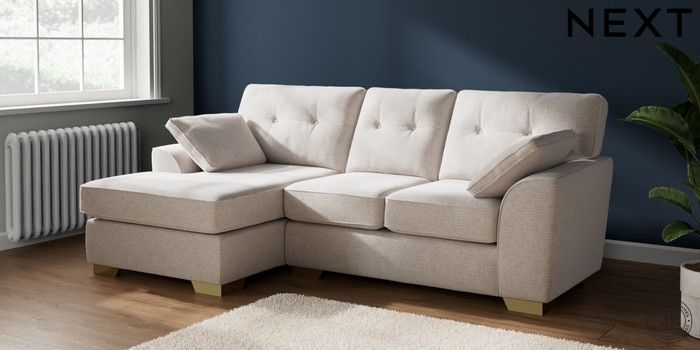 7.2.10 Stamford Buttoned Back Small Sofa Chaise - Left Hand Multi Weave Oyster Large Square Angle - Brushed Brass | Made Click here to use our website with more accessibility support, for example screen readers