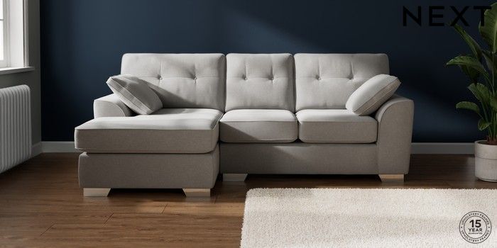 7.2.10 Stamford Buttoned Back Small Sofa Chaise - Left Hand Natural Mix Light Grey Large Square Angle - Chrome Metal | Made Click here to use our website with more accessibility support, for example screen readers