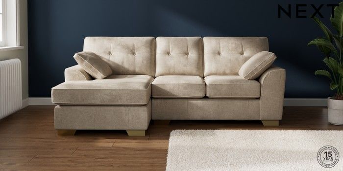 7.2.10 Stamford Buttoned Back Small Sofa Chaise - Left Hand Plush Chenille Light Natural Large Square Angle - Brushed Brass | Made Click here to use our website with more accessibility support, for example screen readers