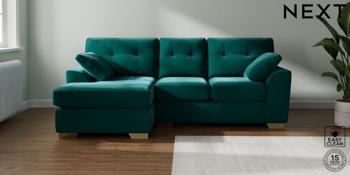 7.2.10 Stamford Buttoned Back Small Sofa Chaise - Left Hand Plush Velvet Easy Clean Juniper Green Large Square Angle - Brushed Brass | Made Click here to use our website with more accessibility support, for example screen readers