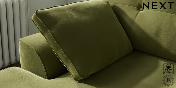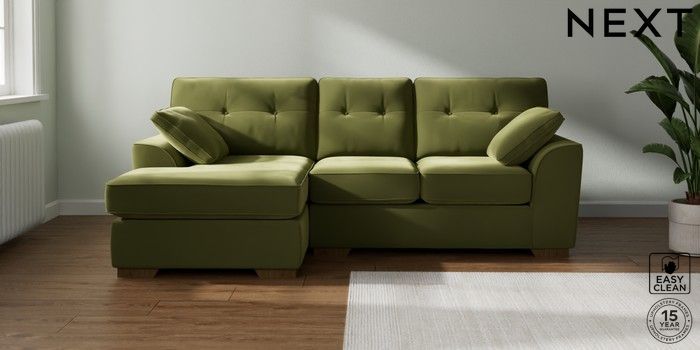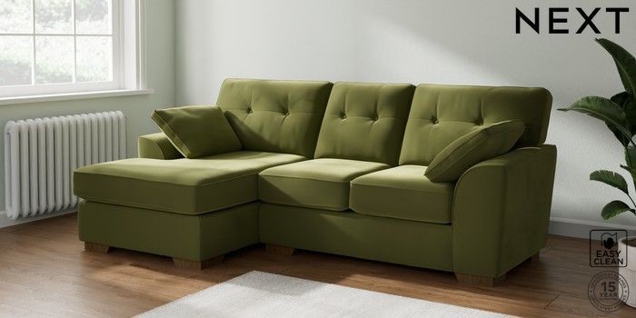 7.2.10 Stamford Buttoned Back Small Sofa Chaise - Left Hand Plush Velvet Easy Clean Mid Olive Green Large Square Angle - Mid | Made Click here to use our website with more accessibility support, for example screen readers