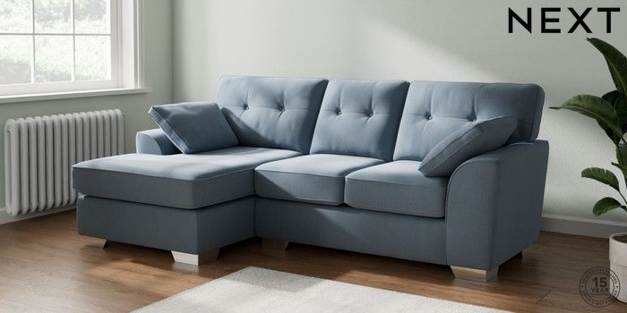 7.2.10 Stamford Buttoned Back Small Sofa Chaise - Left Hand Relaxed Linen Look Mid Blue Large Square Angle - Chrome Metal | Made Click here to use our website with more accessibility support, for example screen readers