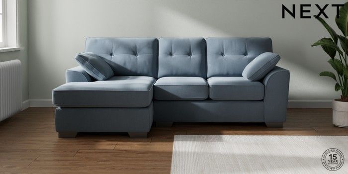 7.2.10 Stamford Buttoned Back Small Sofa Chaise - Left Hand Relaxed Linen Look Mid Blue Large Square Angle - Gunmetal | Made Click here to use our website with more accessibility support, for example screen readers