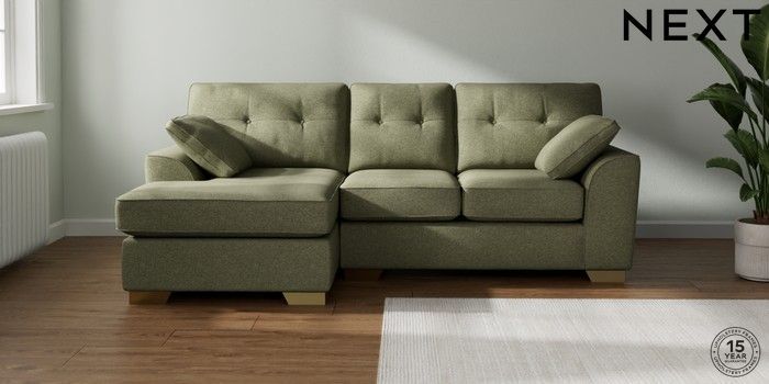 7.2.10 Stamford Buttoned Back Small Sofa Chaise - Left Hand Tweedy Chenille Mid Moss Green Large Square Angle - Brushed Brass | Made Click here to use our website with more accessibility support, for example screen readers