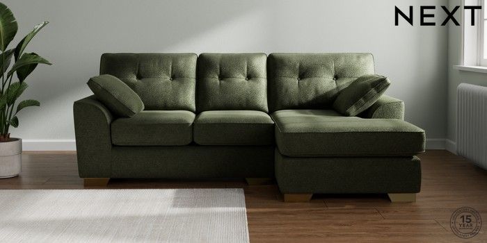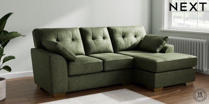 7.2.10 Stamford Buttoned Back Small Sofa Chaise - Right Hand Boucle Chenille Dark Moss Green Large Square Angle - Brushed Brass | Made Click here to use our website with more accessibility support, for example screen readers