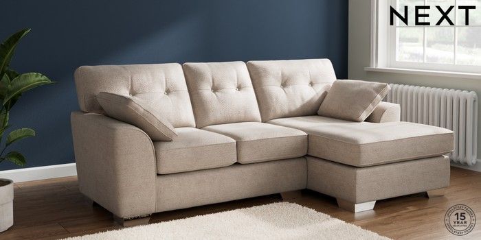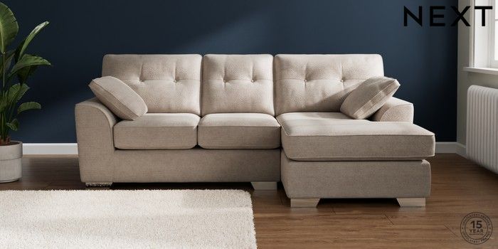 7.2.10 Stamford Buttoned Back Small Sofa Chaise - Right Hand Boucle Chenille Light Natural Large Square Angle - Chrome Metal | Made Click here to use our website with more accessibility support, for example screen readers