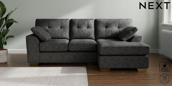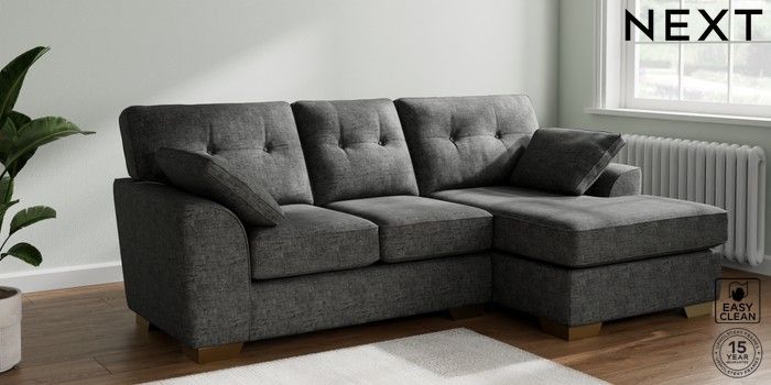 7.2.10 Stamford Buttoned Back Small Sofa Chaise - Right Hand Boucle Weave Easy Clean Charcoal Grey Large Square Angle - Brushed Brass | Made Click here to use our website with more accessibility support, for example screen readers