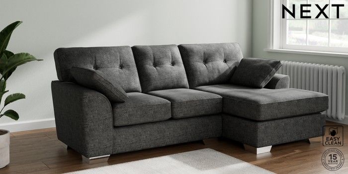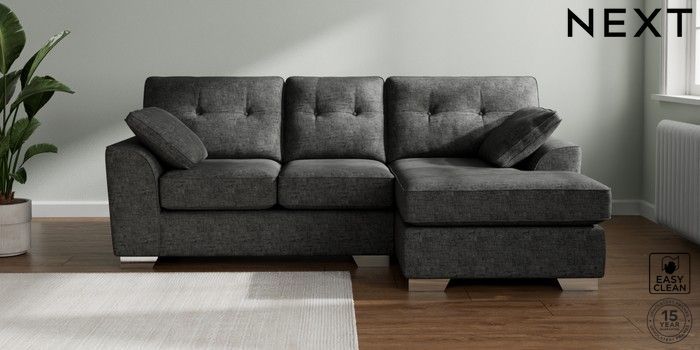 7.2.10 Stamford Buttoned Back Small Sofa Chaise - Right Hand Boucle Weave Easy Clean Charcoal Grey Large Square Angle - Chrome Metal | Made Click here to use our website with more accessibility support, for example screen readers