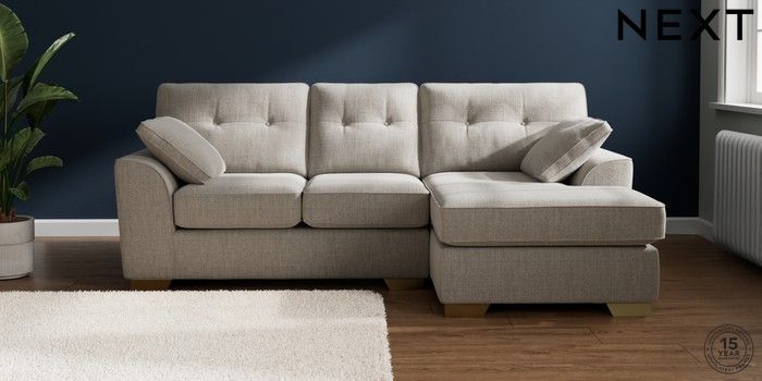 7.2.10 Stamford Buttoned Back Small Sofa Chaise - Right Hand Chunky Weave Dove Grey Large Square Angle - Brushed Brass | Made Click here to use our website with more accessibility support, for example screen readers
