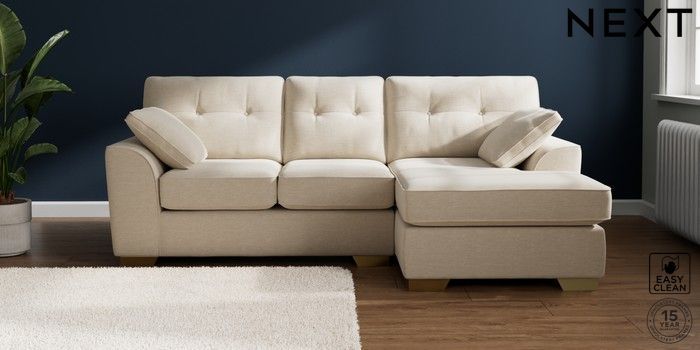 7.2.10 Stamford Buttoned Back Small Sofa Chaise - Right Hand Fine Chenille Easy Clean Oyster Large Square Angle - Brushed Brass | Made Click here to use our website with more accessibility support, for example screen readers