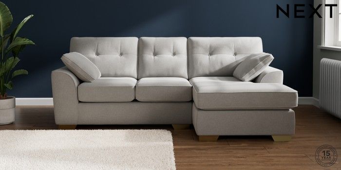 7.2.10 Stamford Buttoned Back Small Sofa Chaise - Right Hand Natural Mix Light Grey Large Square Angle - Brushed Brass | Made Click here to use our website with more accessibility support, for example screen readers