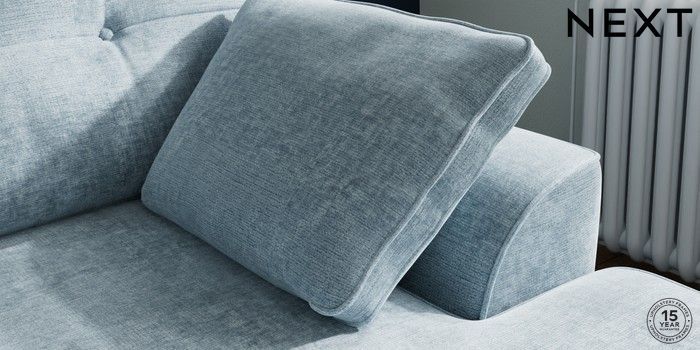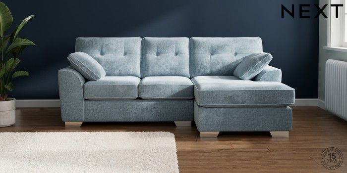 7.2.10 Stamford Buttoned Back Small Sofa Chaise - Right Hand Plush Chenille Light Blue Large Square Angle - Chrome Metal | Made Click here to use our website with more accessibility support, for example screen readers