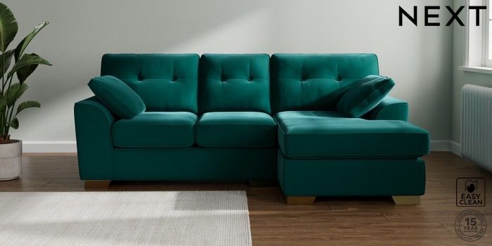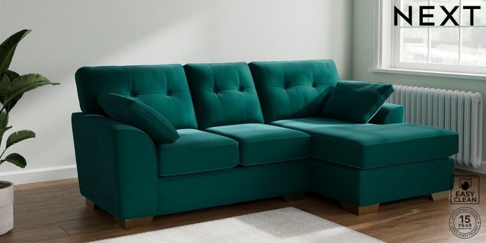 7.2.10 Stamford Buttoned Back Small Sofa Chaise - Right Hand Plush Velvet Easy Clean Juniper Green Large Square Angle - Brushed Brass | Made Click here to use our website with more accessibility support, for example screen readers