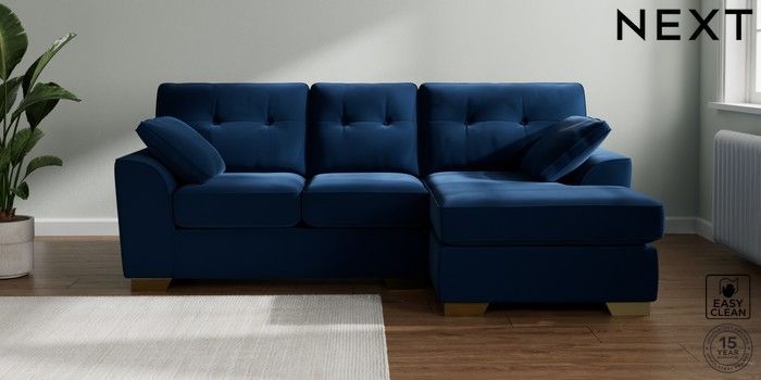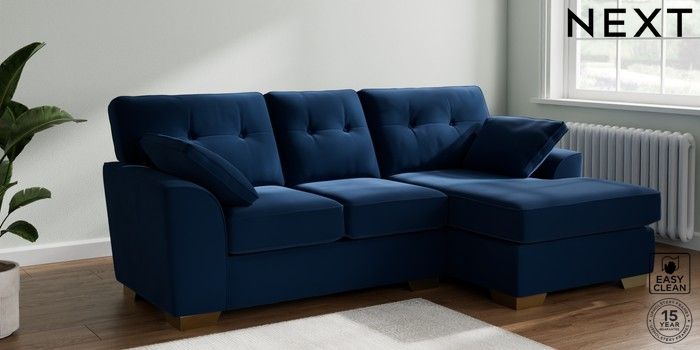 7.2.10 Stamford Buttoned Back Small Sofa Chaise - Right Hand Plush Velvet Easy Clean Navy Blue Large Square Angle - Brushed Brass | Made Click here to use our website with more accessibility support, for example screen readers