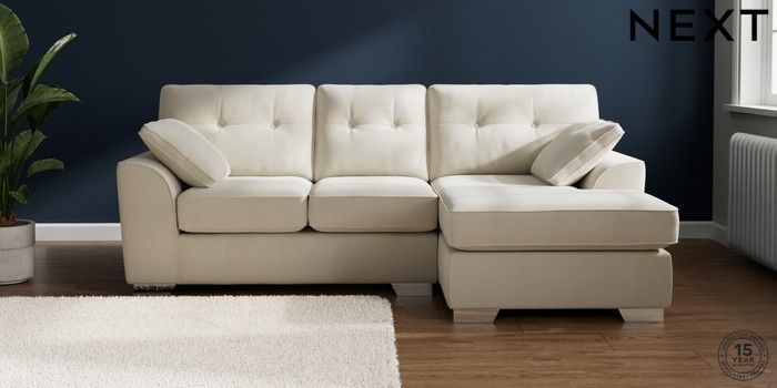 7.2.10 Stamford Buttoned Back Small Sofa Chaise - Right Hand Relaxed Linen Look Oyster Large Square Angle - Chrome Metal | Made Click here to use our website with more accessibility support, for example screen readers