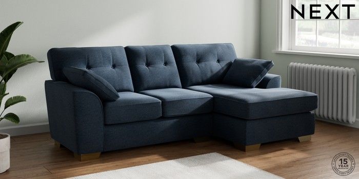 7.2.10 Stamford Buttoned Back Small Sofa Chaise - Right Hand Ripple Chenille Dark Blue Large Square Angle - Brushed Brass | Made Click here to use our website with more accessibility support, for example screen readers