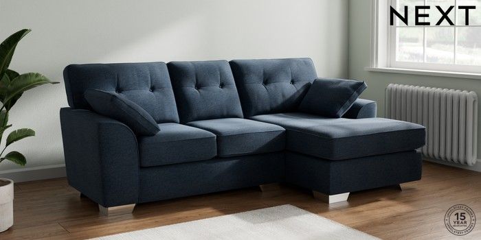 7.2.10 Stamford Buttoned Back Small Sofa Chaise - Right Hand Ripple Chenille Dark Blue Large Square Angle - Chrome Metal | Made Click here to use our website with more accessibility support, for example screen readers