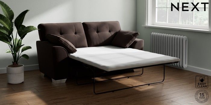 7.2.10 Stamford Buttoned Back Sofa Bed Fine Chenille Easy Clean Chocolate Brown Large Square Angle - Chrome Metal | Made Click here to use our website with more accessibility support, for example screen readers