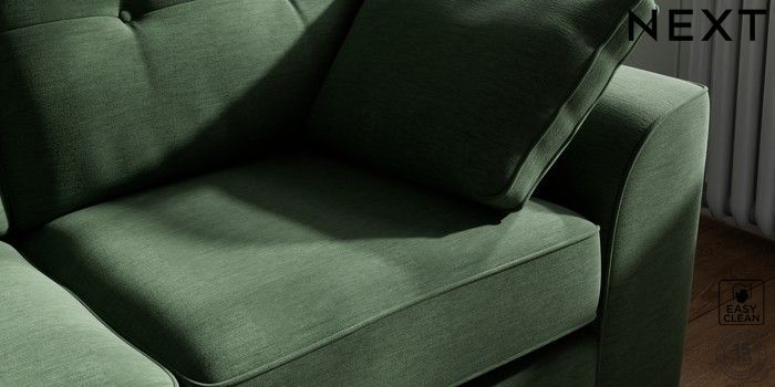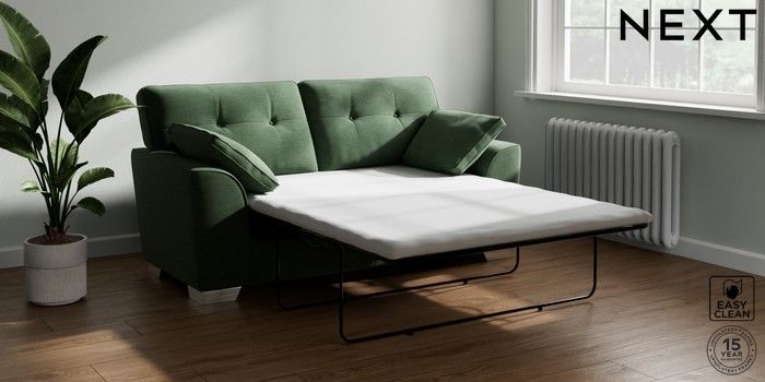 7.2.10 Stamford Buttoned Back Sofa Bed Fine Chenille Easy Clean Mid Khaki Green Large Square Angle - Chrome Metal | Made Click here to use our website with more accessibility support, for example screen readers