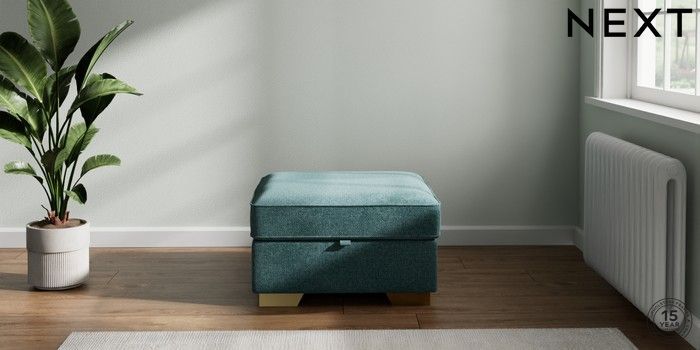 7.2.10 Stamford Buttoned Back Storage Footstool Chunky Chenille Mid Teal Green Square Angle - Brushed Brass | Made Click here to use our website with more accessibility support, for example screen readers