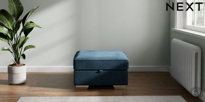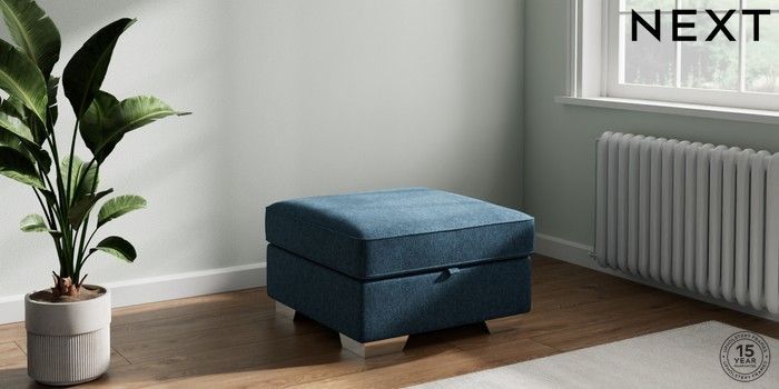 7.2.10 Stamford Buttoned Back Storage Footstool Cotswold Chenille Dark Blue Square Angle - Chrome Metal | Made Click here to use our website with more accessibility support, for example screen readers