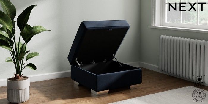 7.2.10 Stamford Buttoned Back Storage Footstool Fine Chenille Easy Clean Dark Navy Blue Square Angle - Chrome Metal | Made Click here to use our website with more accessibility support, for example screen readers