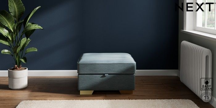 7.2.10 Stamford Buttoned Back Storage Footstool Fine Chenille Easy Clean Mid Blue Square Angle - Brushed Brass | Made Click here to use our website with more accessibility support, for example screen readers