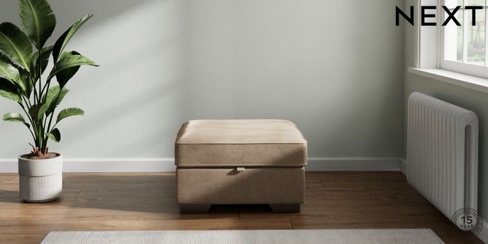7.2.10 Stamford Buttoned Back Storage Footstool Luxe Chenille Mid Camel Beige Square Angle - Gunmetal | Made Click here to use our website with more accessibility support, for example screen readers