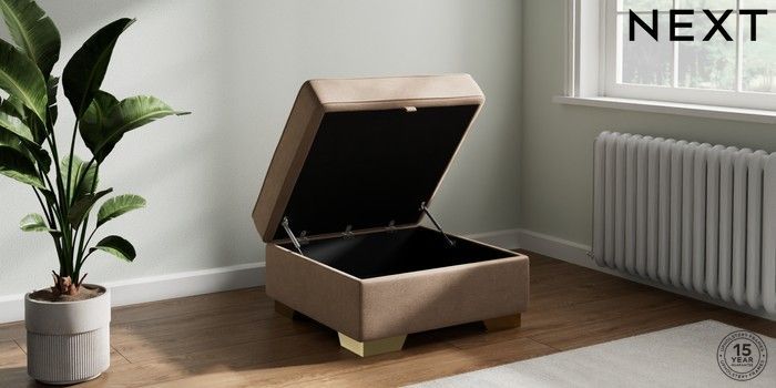 7.2.10 Stamford Buttoned Back Storage Footstool Luxe Chenille Mid Natural Square Angle - Brushed Brass | Made Click here to use our website with more accessibility support, for example screen readers