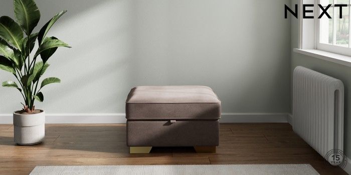 7.2.10 Stamford Buttoned Back Storage Footstool Luxe Chenille Mink Brown Square Angle - Brushed Brass | Made Click here to use our website with more accessibility support, for example screen readers