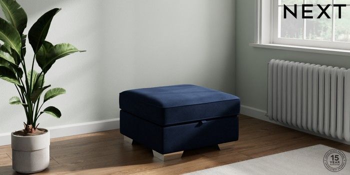 7.2.10 Stamford Buttoned Back Storage Footstool Luxe Chenille Navy Blue Square Angle - Chrome Metal | Made Click here to use our website with more accessibility support, for example screen readers