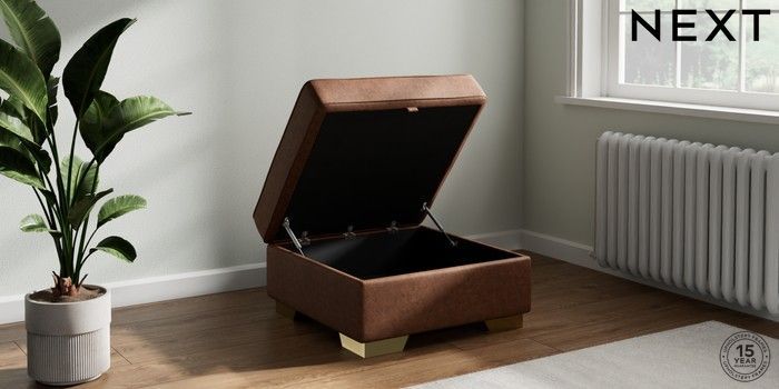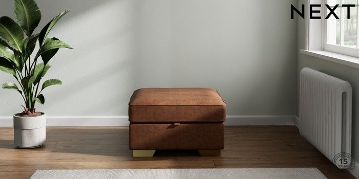 7.2.10 Stamford Buttoned Back Storage Footstool Monza Faux Leather Easy Clean Chestnut Brown Square Angle - Brushed Brass | Made Click here to use our website with more accessibility support, for example screen readers