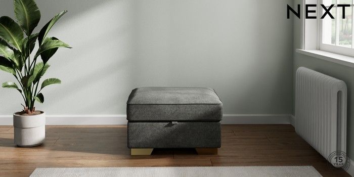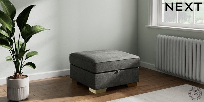 7.2.10 Stamford Buttoned Back Storage Footstool Plush Chenille Dark Grey Square Angle - Brushed Brass | Made Click here to use our website with more accessibility support, for example screen readers