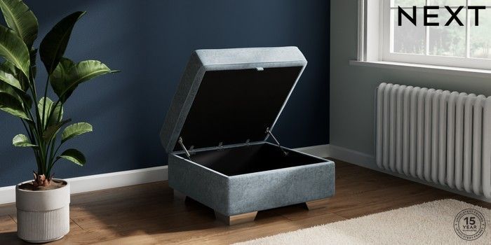 7.2.10 Stamford Buttoned Back Storage Footstool Plush Chenille Light Blue Square Angle - Chrome Metal | Made Click here to use our website with more accessibility support, for example screen readers