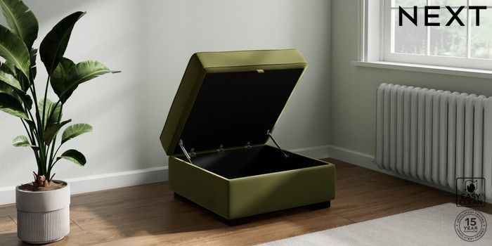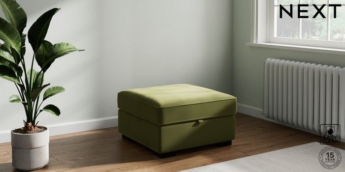 7.2.10 Stamford Buttoned Back Storage Footstool Plush Velvet Easy Clean Mid Olive Green Square Angle - Dark | Made Click here to use our website with more accessibility support, for example screen readers