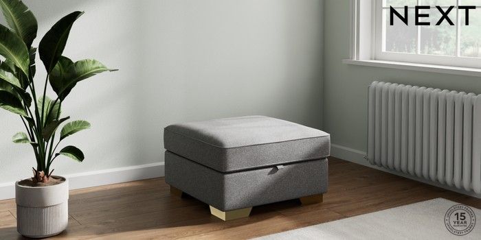 7.2.10 Stamford Buttoned Back Storage Footstool Studio Chenille Mid Grey Square Angle - Brushed Brass | Made Click here to use our website with more accessibility support, for example screen readers