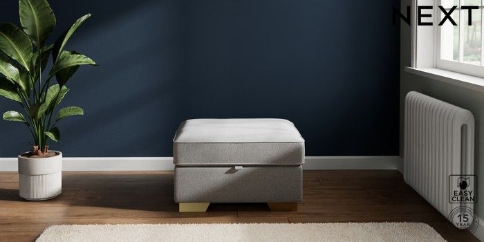 7.2.10 Stamford Buttoned Back Storage Footstool Tweedy Blend Easy Clean Light Silver Grey Square Angle - Brushed Brass | Made Click here to use our website with more accessibility support, for example screen readers