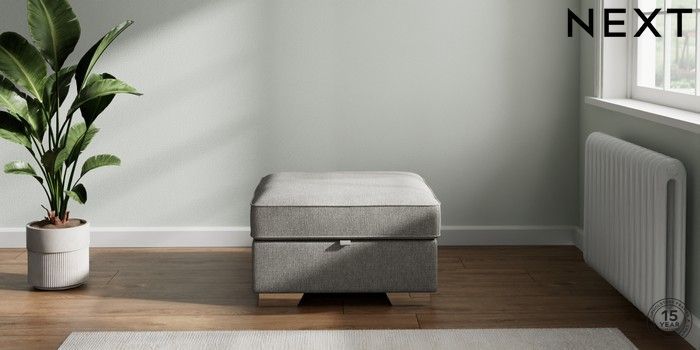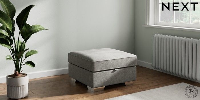 7.2.10 Stamford Buttoned Back Storage Footstool Tweedy Chenille Mid Grey Square Angle - Chrome Metal | Made Click here to use our website with more accessibility support, for example screen readers