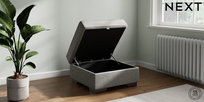 7.2.10 Stamford Buttoned Back Storage Footstool Tweedy Chenille Mid Grey Square Angle - Gunmetal | Made Click here to use our website with more accessibility support, for example screen readers